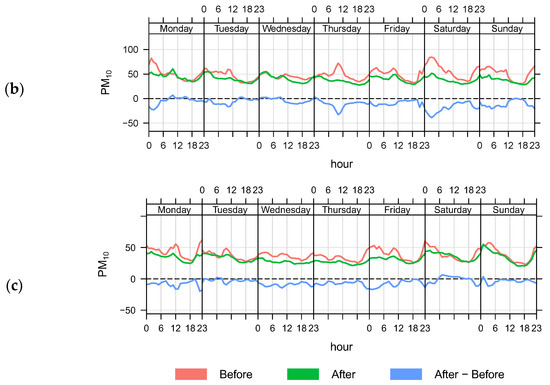 Temporal variations in PM10 (μg/m3) for Kadikoy station with three Phases: (a) Phase I differences, Before: 30 June 2015–11 March 2016 (Red), After: 12 March 2016–30 June 2017 (Green), After–Before (Blue); (b) Phase II differences, Before: 30 June 2017–11 March 2018 (Red), After: 12 March 2018–30 June 2019 (Green), After–Before (Blue); (c) Phase III differences, Before: 30 June 2019–11 March 2020 (Red), After: 12 March 2020–30 June 2021 (Green), After–Before (Blue).