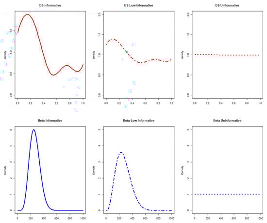 A uniform distribution has been considered as an uninformative prior, as suggested in the literature [], to obtain a prior distribution that is a flexible compromise between a full uninformative prior and an informative function adapted among expert quantiles.