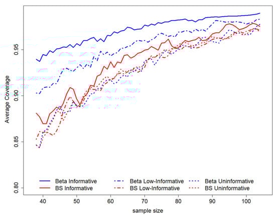 By observing the pattern of the average coverage among all possible intervals in the sampling space, according to to sample size (for a fixed length equal to 0.2), it is possible to evaluate a general increase in sample size as the average coverage level increases (Figure 2). The coverage is higher for all sample sizes for a Beta informative prior distribution and is not much different for other scenarios; in this setting, semiparametric results are more similar to the Beta informative scenario (Figure 2).