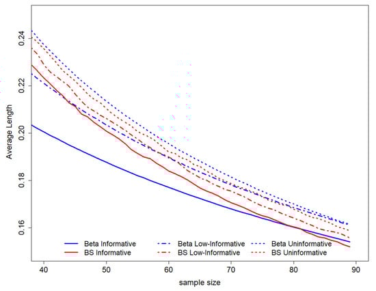 When considering the average length among all possible intervals ensuring coverage of 0.95, it is possible to show evidence that this value decreases with decreasing sample size. The higher average length is observed for the uninformative Beta scenario, while the lower average lengths are evidenced for the Beta informative prior. The B-splines elicitation leads to an average length of HPD that lies between the values derived in both Beta scenarios (Figure 3).