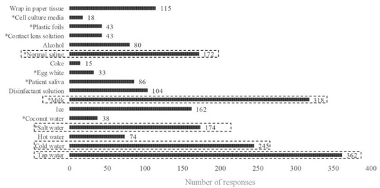 Frequency responses of the students to the question about the storage media of the avulsed tooth. The five most frequently selected media are emphasized. * correct answer.