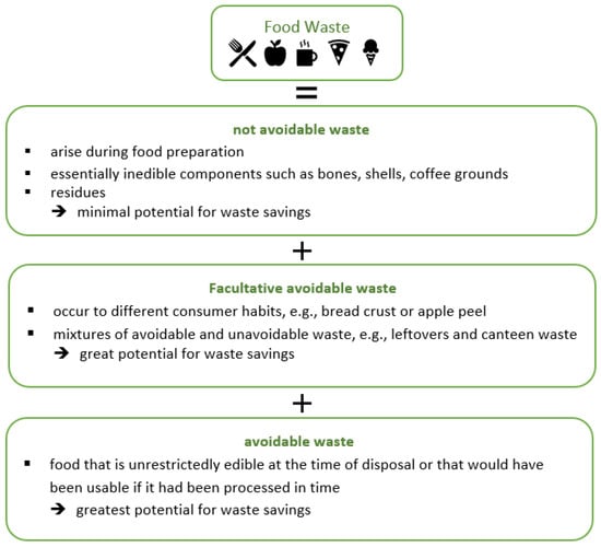 - In food waste diaries household members document the amount of FW during a certain period. FW diaries require the time and effort of participants. Results, however, may be comparatively more accurate than surveys. Households may still adjust their behaviour [30,31,32]. In contrast to WCA, FW diaries allow to analyse the waste composition and its determinants. Food fed to animals, disposed in the sewer, or composted is documented. Some household FW may even not be noted, e.g., food is taken to and wasted at the office or school [12]. Though often overrated, the share of unavoidable waste is estimated [13,33].