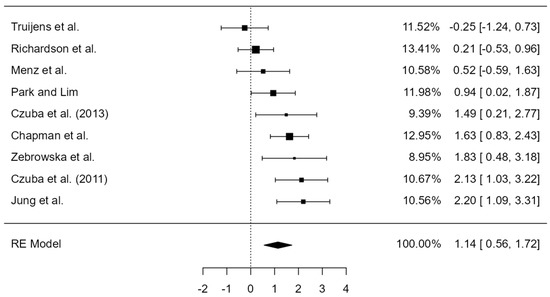 We subsequently performed sensitivity analysis by removing the two studies which fell outside of the funnel [50,51]. This procedure did not cause a qualitative effect (i.e., the direction of overall effect). This resulted in a SMD of 1.51 (95% CI = 1.06–1.96; p < 0.001). We subsequently performed sensitivity analysis by removing the two studies which were not RCTs [44,49]. This procedure did not cause a qualitative effect and the SMD was 1.11 (95% CI = 0.35–1.86; p = 0.004). Finally, we removed the study by Jung et al. [47] to achieve a Trim and Fill value of 0 and the SMD was 1.01 (95% CI = 0.42–1.60; p < 0.01). Therefore, we believe results from the initial meta-analysis are robust against the analysis decisions.