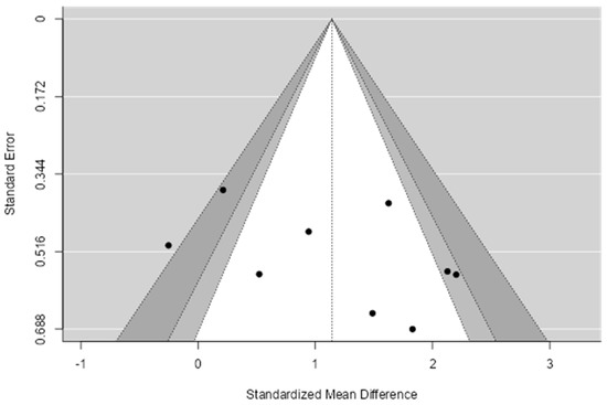The overall SMD for HIIT in hypoxia was 1.14 (95% CI = 0.56–1.72; p < 0.001; Figure 2). Heterogeneity (I2 = 67%) justified the use of a random effects model. The Richardson et al. [50] study was weighted the most within the meta-analysis (13%), whereas Zebrowska et al. [52] carried the least weight (9%). Visual inspection of the funnel plot (Figure 3) suggest studies were spread across both sides of the pooled SMD (i.e., without asymmetry) indicating low publication bias. The Trim and Fill method confirmed the number of inputted studies to eliminate publication bias was one, although the overall number of studies was an uneven number. In the next paragraph we describe our sensitivity analysis where we removed one studies to achieve a value of zero (i.e., plot symmetry).