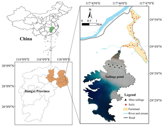 The studied copper tailings pond is in the typical non-ferrous mining area of the northeast part of Jiangxi Province in China. The predominant climate of the studied region is a subtropical monsoon climate, with an average annual temperature of 18.8 °C [38]. The mean annual precipitation of 1823 mm, with the rainy season, starts in April and ends in July. The weather is of sufficient sunshine and abundant precipitation, which is suitable for the growth of a variety of crops, one of which is rice. There is a stream near the north of the tailings pond with a total length of about 10 km. The stream flows through farmland and then falls into the river.