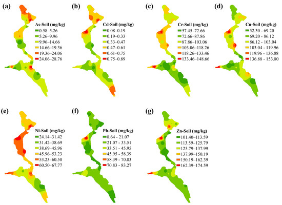 Spatial distribution of (a) As, (b) Cd, (c) Cr (d) Cu, (e) Ni, (f) Pb and (g) Zn in soils.