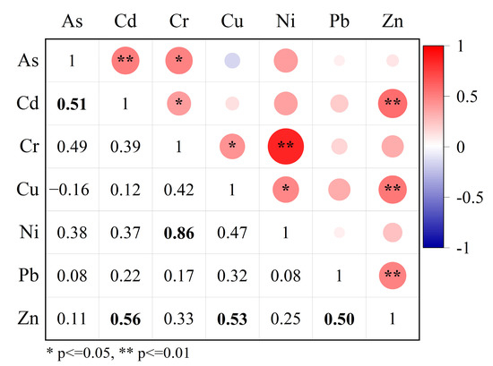Pearson correlation analysis was carried out to determine the relationship among heavy metals content in soils, and the correlation coefficients (r) are shown in Figure 3. The greater the correlation coefficient, the more likely these heavy metals have similar sources or influencing factors [27,62]. It can be seen that As-Cd, Cr-Ni, Cd-Zn, Cu-Zn, and Pb-Zn were significantly correlated at 0.01 level, while As-Cr, Cd-Cr, Cr-Cu, and Cu-Ni were significantly correlated at 0.05 level. Cr and Ni are highly correlated (r > 0.8, p < 0.01) while Cr-Cu and Cu-Ni are moderately correlated, indicating that Cr, Cu, and Ni may also have the same or similar sources. Zn is significantly correlated with Cd, Cu, and Pb, suggesting that there may be multiple sources. As is only significantly correlated with Cd, but not with other heavy metals, indicating that As may come from another source.