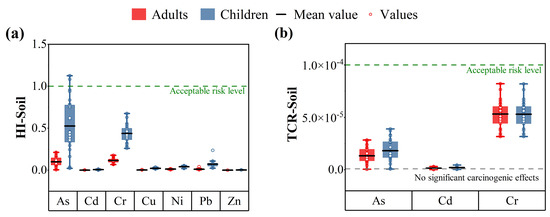 Heavy metals can pose a potential health risk to humans through chronic exposure of polluted soil particles. The human health risks of heavy metals in soils include non-carcinogenic risk and carcinogenic risk, posed by soil heavy-metals for adults and children via three potential routes including oral ingestion, dermal contact, and inhalation [71]. The calculated results of the health risk assessment (non-carcinogenic and carcinogenic risks) of soil heavy-metals were listed in Table S4. The HQ and CR via oral ingestion are higher than dermal contact or inhalation for both adults and children in the study region. The results indicate that oral ingestion is the main exposure route that is most likely to impact health risk, which is consistent with the reports in the literatures [61,72,73]. In the present study, HQingestion, HQdermal, and HQinhalation values of seven heavy metals for children were higher than those for adults in the study region. In other words, children in the study region have higher soil non-carcinogenic risks than adults via the three exposure routes. Previous studies have also shown that children have higher risks in polluted areas due to higher soil ingestion and lower body weight [51,74,75]. It can been seen from Table S4, the non-carcinogenic risk (HI) values for As, Cd, Cr, Cu, Ni, Pb and Zn for adults were varied from 4.34 × 10−3 to 2.13 × 10−1, 2.95 × 10−4 to 3.43 × 10−3, 6.89 × 10−2 to 1.78 × 10−1, 2.29 × 10−3 to 6.73 × 10−3, 6.32 × 10−3 to 1.78 × 10−2, 4.38 × 10−3 to 4.22 × 10−2, and 5.95 × 10−4 to 1.02 × 10−3, while children were 2.29 × 10−2 to 1.13 × 100, 1.14 × 10−3 to 1.32 × 10−2, 2.61 × 10−1 to 6.77 × 10−1, 1.29 × 10−2 to 3.79 × 10−2, 1.95 × 10−2 to 5.48 × 10−2, 1.28 × 10−2 to 2.45 × 10−2, and 3.34 × 10−3 to 5.76 × 10−3, respectively. According to Figure 5a, the values of HI of each heavy metal except As, were lower than 1, suggesting no serious non-carcinogenic health risk for both children and adults. Specifically, for children, the HI values of As were higher than unit (HI > 1), which reflects that children are exposed to adverse health effects of As in soils in the investigated region. According to the study of Teng et al., As with low RfD values posed a relatively higher non-carcinogenic risk to people than other trace elements [31]. The non-carcinogenic risk of each heavy metal for children was higher than that for adults, reflecting that children are more sensitive to the adverse health effects of heavy metals.