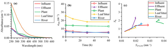(a) The absorbance spectra of CDOM from different sources, (b) changes in the absorption coefficient of CDOM (a280) with the irradiation time, and (c) changes in the spectral slope (S275–295) and slope ratio (SR) by the irradiation, with the arrows showing the direction of changes.