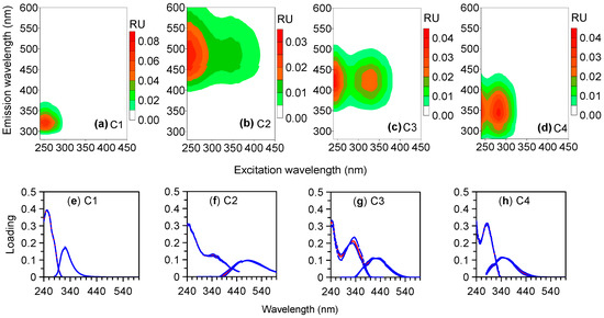 (a–d) EEM contours of the four fluorescent components (C1–C4) identified with PARAFAC in this study and (e–h) their excitation and emission loadings based on the whole dataset (red solid lines) and random halves in split-half analysis (blue dotted lines).