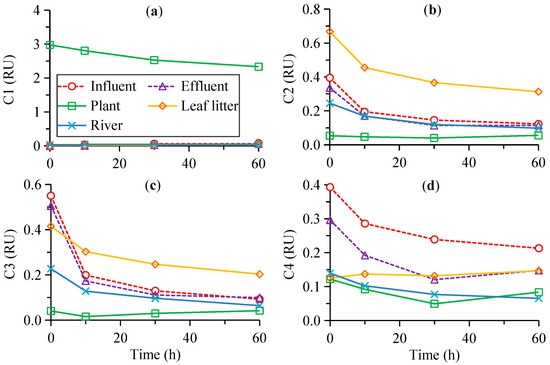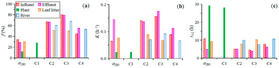 The f of C1 was 28.2% for the plant leachate, with a low k of 0.025 h−1 and a high t1/2 of 28.1 h (Figure 5). The f of C2 and C3 were lowest for the leaf litter leachate (51.3% and 49.8%), which increased to 60.1%–67.6% for the river and were highest for the influent and effluent (66.5%–66.7% and 79.4%–80.3%). The k of C2 and C3 were lower for the leaf litter leachate and river (0.068–0.091 h−1) than for the influent and effluent (0.137–0.175 h−1). Correspondingly, the t1/2 of C2 and C3 were higher for the leaf litter leachate and river (7.6–10.2 h) than for the influent and effluent (4.0–5.1 h). The f of C4 was lower for the influent (44.4%) than for the effluent and river (53.3%–55.1%), while C4 did not fit the exponential decay modeling for the plant and leaf litter leachates. The k of C4 was higher for the effluent (0.112 h−1) than for the river and influent (0.065–0.089 h−1). Correspondingly, the t1/2 of C4 was shorter for the effluent (6.2 h) than for the influent (7.8 h) and river (10.6 h).