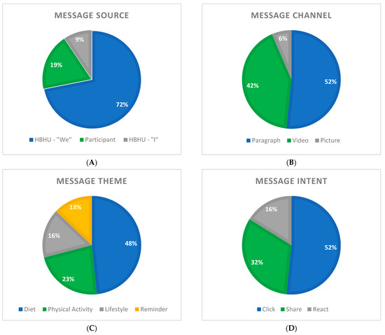 For this analysis, only the first four weeks of posts were coded and analyzed. It should be noted much of the first four weeks focused on diet (Figure 4C). Future research should expand to a larger selection of data to achieve a clearer and more complete idea of how Facebook post characteristics and engagement are related. This, however, proves to be a promising start. This is also a slightly incomplete data picture in that clickthrough data for the video links was unavailable, as this study was not designed for this retrospective analysis. Clickthrough data could change how engaging some of the lower effect posts were, and future interventions aiming to measure constructs like engagement at a more granular level should take this into consideration.