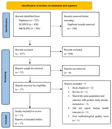 The initial search of the two databases and hand-curated literature yielded 723 publications, of which 246 duplicates were identified and removed. The remaining 477 publication’s titles and abstracts were screened against the inclusion criteria. At this stage, 450 publications were excluded, allowing 27 to advance into the full-text screening phase. After the full-text screening, 10 publications were excluded with reasons (Supplementary Table S5), and the remaining 17 publications were deemed eligible for inclusion in the review. Figure 1 provides a PRISMA flowchart representing the process of study selection for this review.