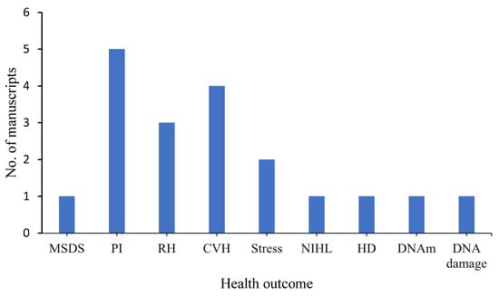 Summary of manuscripts that reported on various health outcomes. Abbreviations: MSDS—musculoskeletal disease symptoms; PI—physical injuries (cuts, lacerations, etc.); RH—respiratory health; CVH—cardiovascular health; NIHL—noise-induced hearing loss; HD—hepatic disease; DNAm—DNA methylation. NB: Some manuscripts reported more than one health outcome.