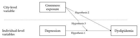 Multiple studies have examined the association between individual/contextual factors and dyslipidemia, but the exact etiology of dyslipidemia remains implicit [29]. To the best of our knowledge, few studies have used both environmental factors and an individual’s psychological attributes—for example, depression—to predict the level of dyslipidemia. Specifically, much less attention has been paid to the moderate effect of greenness on the association between the psychological burden and dyslipidemia, especially in developing countries. In the context of an aging population, the exploration of the relation between greenness, depression, and dyslipidemia may have public health significance in China. Therefore, the objective of our study was to examine whether greenness and depression can be predictive of dyslipidemia. In addition, our study also serves as an attempt to explore the underlying mechanism between greenness, depression, and dyslipidemia, and specifically the moderate effect. Hence, we made three hypotheses (Three hypotheses involved in the study were presented in Figure 1.):