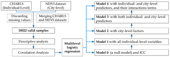 Data analyses were conducted using STATA. Descriptive statistic was used to summarize the frequency and percentages or the mean values of characteristics of study participants and city-level NDVI. The correlation matrix model was performed to identify the relationship between dyslipidemia and individual characteristics, as well as city-level NDVI. Furthermore, due to the hierarchical structure of dataset and the binary outcome variable of dyslipidemia, multilevel mixed-effects logistic regression was fitted to identify the predictors of dyslipidemia in China, which has been increasingly recognized as a useful tool for examining the effect from group level and individual level simultaneously [52]. Flowchart of the study were illustrated in Figure 3.