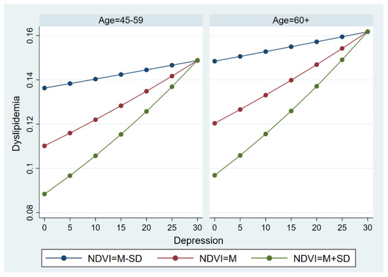 We sought to determine whether the moderate effect of the NDVI on the relationship between depression and dyslipidemia was variant in the younger group (respondents aged 45–59) and the elderly (Figure 5). In general, the NDVI functioned as a moderator that affects the association between depression and dyslipidemia. Similar to the results among the whole sample, the effect of the NDVI was attenuated when the level of depression approached 30. In comparison, the elderly were more likely to suffer from dyslipidemia than those aged 45–59, indicating that there were obvious differences in the model in younger subjects and the elderly.