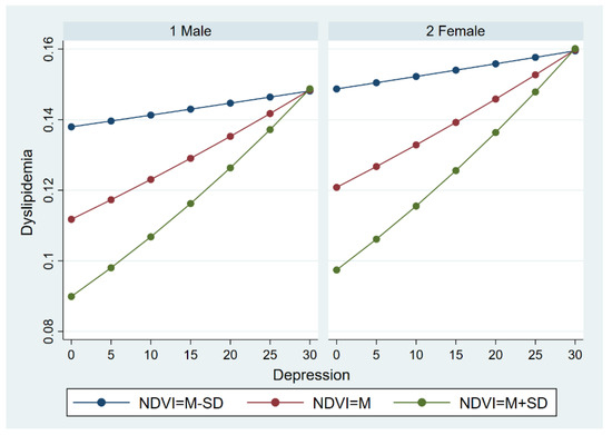 Multilevel logistic regression was further carried out to examine the moderate effect described previously across gender groups. Similar to the results among the whole sample, the effect of depression on dyslipidemia can also be moderated by the NDVI, both in the male and female group. Likewise, the moderate effect of the NDVI gradually decreased as the level of depression increased. However, there was an apparent difference in dyslipidemia between the male group and female group. For a given depression and a given NDVI level, females were at a greater risk of dyslipidemia than males. The details are illustrated in Figure 6.