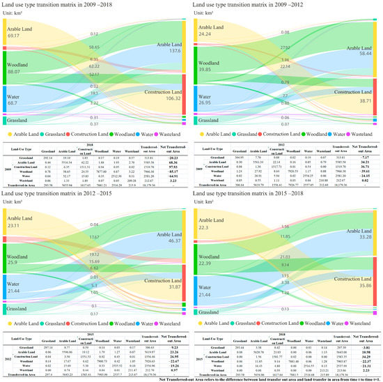 This study used the overlay analysis tool of ArcGIS to establish the land use transition matrix (Figure 3). In general, the transfer of construction land was the hotspot of the land use transfer trend in 2009–2018. The transfer out of ecological land, such as woodlands and water, was the most severe, indicating that the ecological construction pattern has not yet stabilized in some areas. Arable land, construction land, and wasteland were the main types of transfer, and the transfer-in areas were 68.36 km2, 97.93 km2, and 3.23 km2. Woodland, grassland, and water were the main types of transfer-out, and the transfer-out areas were 85.17 km2, 20.23 km2, and 64.91 km2.