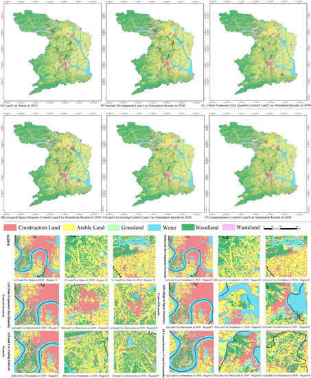 In the Land Use Zoning Control Scenario, the construction land showed obvious fragmentation and expansion characteristics in space. The overall shrinking trend of ecological land has moderated. The main body of occupation of woodland and water was transferred from construction land to arable land (Figure 5f).