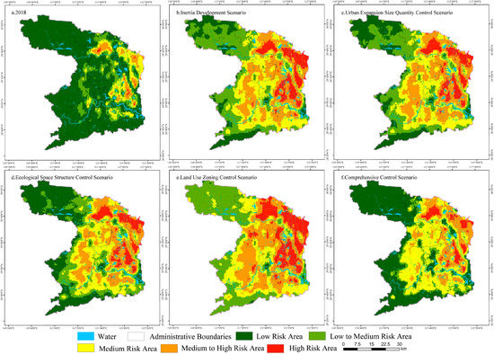 The increase in landscape ecological risk in the land use zoning control scenario was significantly higher than in the other scenarios, while the landscape ecological risk in the comprehensive control scenario was smaller than in the other scenarios. This showed that comprehensive control had the effect of reversing risk expansion in the local space. Therefore, comprehensive control was the best for effectively preventing landscape ecological risk and curbing the disorderly expansion of construction land. Ecological spatial structure control could effectively maintain the structural connectivity and integrity of the regional ecosystem, and urban expansion size quantity control had an obvious curbing effect on the expansion of construction land.