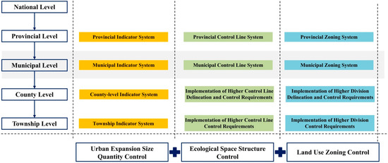 - The territorial spatial planning control at the municipal level focuses on the control of upper-level constraints and the control of the overall pattern and makes strategic and systematic arrangements for space protection and development. It is recommended to build a planning control transmission system of “quantity + structure + zoning” in the future. Quantity control and transmission reflect the rigid constraints of territorial space and should be further continued and optimized. Structural control and transmission should realize the overall planning of the control of core space elements, and the municipal level should strengthen overall planning and coordinate contradictions. Zoning control and transmission should reflect spatially differentiated control (Figure 9).