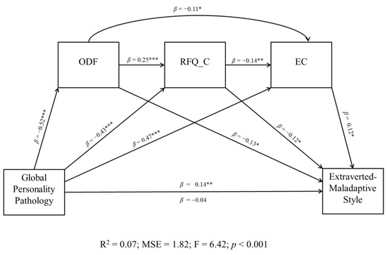 A Sequential Mediation Model Examining the Direct and Indirect Effects of Global Personality Pathology on Extraverted-Maladaptive Response Pattern to the COVID Pandemic and its Mitigation Strategies. Note. ODF = Overall Defensive Functioning; RFQ_C = Certainty About Mental States; EC = Epistemic Credulity. β = Standardized Beta Coefficient; R2 = R-squared; MSE = Mean Squared Error; F = F-distribution. * p ≤ 0.05. ** p ≤ 0.01. *** p ≤ 0.001.
