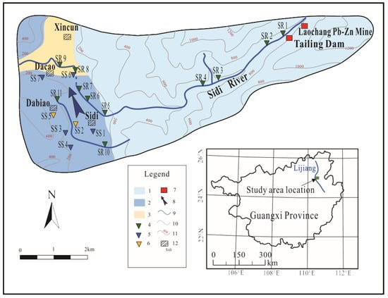 The Sidi River’s karst basin is located in the Guilin-Yangshuo basin in southwest China, covering an area of about 10 km2. The region is a subtropical monsoon climate, with 70 percent of the rainfall (1200 mm) occurring between April and August and an annual average temperature of 19 °C. The basin includes unconfined non-karstic aquifers of Cambrian–Devonian (Є-D) sandstones in the mountainous area to the east, unconfined Devonian (D) to Carboniferous (C) karst aquifers to the west, unconfined karst aquifers in Devonian (D) carbonates underlying discontinuity, Quaternary (Q) clay, and clay loam [24]. Karst aquifers provide drinking water for residents. A karst conduit and a surface river (the Sidi River) originate in the Sidi River’s karst basin. The Sidi River originates from the eastern mountain area where the Laochang Pb–Zn mine is located. The river water flows westward through Sidi village, northward through the karst conduit, and finally into the Dayuan River. The karst conduit is about 2 m high and 1 km long (Figure 1).