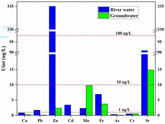 According to PCA, we calculated the weight of each dissolved heavy metal in the water of the study area (Table 5). The calculated method of the HQ and HI was shown in Equations (2)–(6). The HQingestion, HQdermal, and HI values were much less than 1 (Table 6), indicating that these elements were less harmful. Compared with dermal, ingestion was the main route, by which these dissolved heavy metals harmed humans. Children’s HQingestion, HQdermal, and HI values were higher than adults, indicating that children were more vulnerable than adults exposed to the same environment. The HQingestion and HI of As and the HQdermal of Cd were highest in river water, and the HQingestion and HI of As and the HQdermal of Cr were highest in groundwater, indicating their potential hazards.