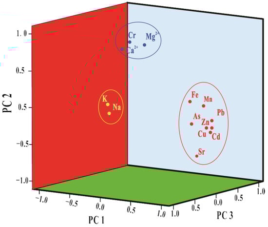Principal component analysis (PCA) was used to identify the sources of dissolved metals in the study area [37,38]. The Kaiser–Meyer–Olkin and Bartlett values of the test results (0.732 and 0.000, respectively) showed that the data of this study were suitable for principal component factor loading analysis [29]. Three principal components (PC1, PC2, and PC3) were extracted from 13 elements in the Sidi River’s karst basin. The sum of the variance of these three principal components was 90.55% (Table 3, Figure 3).