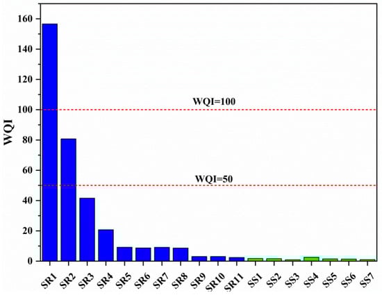 The water quality index (WQI) value of each sampling point is calculated in Equation (1) (Figure 5). The WQI values in the Sidi River’s karst basin varied from 0.9 to 156.6, with an average of 19.7. Sample SR1 (WQI = 156.6) was poor water; sample SR2 (WQI = 80.7) was good water; and other water samples (WQI < 50) were excellent water. Eighty-two percent of the samples in the Sidi River were excellent water, and all the samples in the groundwater were excellent water. The poor water was because the sampling locations (SR1 and SR2) were closer to the tailings dam and more seriously affected by mine drainage (Figure 1).