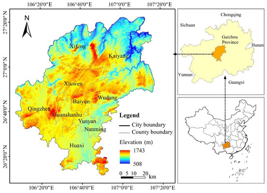 Guiyang City is located in the middle part of the original hills of the central Guizhou Mountains, which belongs to the watershed zone of the Yangtze River and the Pearl River. The terrain is high in the southwest and low in the northeast. The highest elevation of the province is 2885 m and the lowest is 152 m. The geomorphology here mainly consists of mountainous and hilly areas (Figure 1), among which, the mountain area covers about 4217 km2, accounting for 52.43%, while the hill area is about 2840 km2, taking up 35.31%, and other types of land account for about 12.26%. By the end of 2020, the total population was 5.9898 million, the primary industry value was USD 0.0025 billion, that of the secondary industry was USD 0.0214 billion, that of the tertiary industry was USD 0.0355 billion, the per capita GDP was USD 9940.76, and the total financial revenue was USD 12,136.9624 billion. The total land area of the city is 8043 km2 in the year 2022, and the land type area is taken as an example. Among them, the cultivated land area covers an area of 2112.49 km2, accounting for 26.26%; the forestland area is 3906.57 km2, accounting for 48.57%; the grassland area is 1342.58 km2, accounting for 16.69%; the water body area is 135.19 km2, taking up 1.68%; the construction land area covers 542.36 km2, accounting for 6.74%; and the unutilized land is 3.84 km2, accounting for 0.047%.