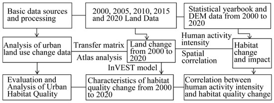 The research is based on the land use change data for 2000, 2005, 2010, 2015 and 2020. Firstly, the research data and DEM data were collected for preprocessing. After vectorization, accuracy testing and verification procedures were carried out. Secondly, for land data and statistical yearbook data, the characteristics of land spatial change were described using the transfer matrix, atlas analysis, InVEST model and other methods. Thirdly, the human activity intensity index and bivariate spatial autocorrelation were adopted to analyze the closeness and influence of their spatial connection. Finally, the spatial characteristics based on the characteristics of land-use change and habitat quality change in these five periods were summarized, and the response trend of habitat quality change was analyzed. The research framework was shown in Figure 2.