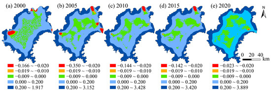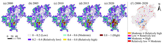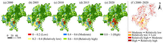 Through the habitat quality module of the InVEST model, the habitat quality level area and change ratio table of Guiyang (Table 4) and the habitat quality spatial change distribution map of Guiyang from 2000 to 2020 (Figure 3) were obtained. Referring to previous research results [16], the results of habitat quality assessment in Guiyang were divided into five categories, i.e., low (0–0.2), relatively low (0.2–0.4), moderate (0.4–0.6), relatively high (0.6–0.8) and high (0.8–1), according to the Equal Interval method in ArcMap using ArcGIS10.3 software.