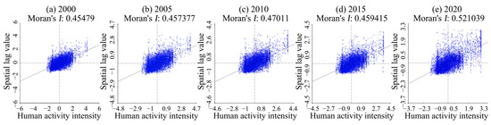 Moran’s scatter plot of changes in human activity intensity and habitat quality in Guiyang from 2000 to 2020.