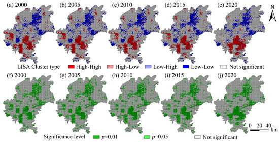 The spatial autocorrelation index between human activity intensity and habitat quality in Guiyang from 2000 to 2020 was analyzed using Geoda 095i software, and the scatter plot of Moran’s I from 2000 to 2020 was obtained (Figure 5). As shown in the figure, the distribution of Moran’s I is relatively uniform in all quadrants, with more distributed in the first quadrant, indicating the obvious spatial correlation characteristics of the intensity of human activities and habitat quality space. The scatter analysis of Moran’s I trend shows that the intensity of human activities and habitat quality space in the study area are correlated, and that the correlation is relatively significant. The correlation between the two periods from 2000 to 2005 was weak, presenting a gradually weakening trend. The first quadrant of 2010 showed a relatively obvious positive correlation, and the change from 2015 to 2020 was relatively significant, indicating a negative correlation. The spatial correlation between the intensity of human activities and habitat quality was weak from 2000 to 2005. Considering the constraints of economic development and the topographic conditions, less amount of land was used for ecological land transfer and construction in Guiyang during this period, and the impact of human economic activities on urban habitat quality was weak as well. In 2010, due to the implementation of the policy of returning farmland to forest or grassland, the regional habitat quality was improved to a certain extent. However, the habitat quality in Guiyang decreased significantly from 2015 to 2020, which was attributed to the upsurge of urban construction in Guiyang, and the intensity of human activities affected the regional habitat quality level. The transformation of a large number of ecological land and water body areas into construction land gave rise to the relatively obvious and frequent spatial land-use map changes. The spatial differentiation of the regions with correlation in Moran’s scatter plot was analyzed using the LISA cluster analyzing method, and the LISA cluster map was drawn by the Z test (P = 0.05) (Figure 6). The relationship between human activity intensity and habitat quality was significant, but the high-high and the low-low types showed a clustering trend. From 2000 to 2020, the proportion of high-high agglomeration distribution areas presented a trend of gradual decrease, and the decrease was not obvious. The significance level of LISA cluster analysis shows that most areas of Guiyang are not significant, while the high-high type showed a high significance level that was staggered in the 0.01 and the 0.05 region. From 2000 to 2020, the distribution with a significance level of 0.01 showed a dynamic change. In 2010, the area of 0.01 distribution decreased, representing an increase in the spatial difference, while the area of 0.05 distribution increased, indicating that the spatial difference was being gradually narrowed.