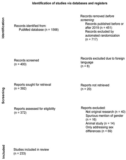 On 15 March 2020, we searched the biomedical database PubMed for articles claiming the identification of gender difference(s). We identified articles describing gender differences in title or abstract published in the year 2019 using the search string “gender differenc*” [Title/Abstract] AND (“2019/01/01” [ppDAT]: “2019/12/31” [ppDAT]). We exported the resulting 1568 articles into the reference manager Endnote (Clarivate, Philadelphia, PA, USA). After removal of articles that were published before or after 2019, due to, e.g., advanced online publishing, 1117 articles remained. Of these articles, a sample of 400 publications was chosen using the randomization strategy offered in the Excel program with the command “=RAND()”. The generator attributes random numbers to the whole dataset; the numbers 1–400 were selected for analysis. Ninety-eight publications were excluded (Figure 1): 40 articles were not original research (e.g., meta-analysis, review, theory, comment), for 20 no full text could be retrieved by the librarian, 16 had a spurious mention of gender, 14 were animal studies and 8 were published in a foreign language. Out of the remaining 302 articles, 69 only addressed sex differences. The remaining 233 publications full text articles were qualitatively analyzed. The articles about sex differences are excluded in the data analysis.