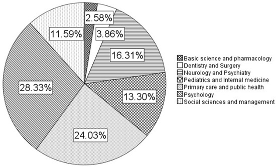 Of the 302 included articles, 233 addressed gender differences and 69 exclusively focused on biological sex (Figure 1). After initial characterization, we excluded the latter from further analysis. Of the articles addressing gender differences, 28.1% were published in psychology journals, 23,8% in the field of primary care and public health, 16.5% in neurology and psychiatry, 13.4% in pediatrics and internal medicine, 11.7% in social sciences and medicine, 3.9% in dentistry and surgery and 2.6% in basic science and pharmacology (Figure 2). In the group of articles addressing exclusively sex differences, 39.1% were published in the field of pediatrics and internal medicine, 20.3% in basic science and pharmacology, 17.4% in dentistry and surgery, 13.0% in neurology and psychiatry, 7.2% in primary care and public health, 1.4% in psychology and 1.4% in social sciences and management.