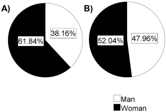 Authorship distribution. Authorship was inferred by allocation of first names, as well as web searches for identification in CV, institutional pages or social media. Authorship is reported for first (A) and last (B) authors.