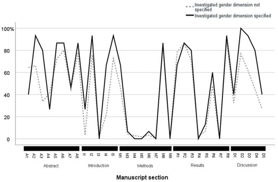 At the level of the abstract, articles that specified the investigated gender dimension more frequently reported the explicit objective of conducting gender-specific research (93% and 66%, respectively) and provided significantly more gender-related information (80% vs. 34%, respectively). We could identify no differences in the methods, results and discussion sections of the abstract.