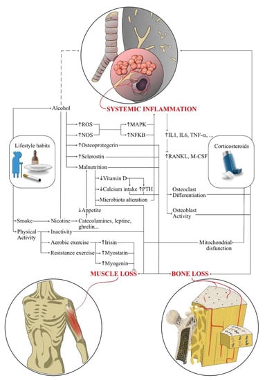 Altogether, these factors may be considered as the basis of a vicious circle, promoting the development of cardiovascular diseases, cachexia, sarcopenia, and osteoporosis in COPD patients. In particular, bone metabolism might be crucially affected by pro-inflammatory cytokines interacting with several pathways involved in bone remodelling. In particular, recent research has underlined that TNF-α, IL-1, IL-6, and IL-17 are the most important cytokines triggering inflammatory bone loss [62]. In addition, proinflammatory cytokines negatively affect receptor activator of nuclear factor-κB ligand (RANKL) and macrophage colony-stimulating factor (M-CSF), with the consequent upregulation of osteoclast differentiation and function-promoting bone resorption [63]. On the other hand, systemic inflammation is a widely documented risk factor for sarcopenia, promoting imbalances between anabolic and catabolic pathways and resulting in muscle wasting. In this context, systemic inflammation is often linked to age-related mitochondrial impairment with the consequent increase in reactive oxygen species (ROS), and unbalanced nitric oxide synthase (NOS) [23,64]. Interestingly, it has been proposed that oxidative stress might promote protein synthesis impairment, inducing lipofuscin deposition and inadequate proteolysis [65]. Moreover, a growing literature has underlined a strong correlation among high CRP levels, IL-6, TNF-α, skeletal maturation, and muscle wasting [66,67].
