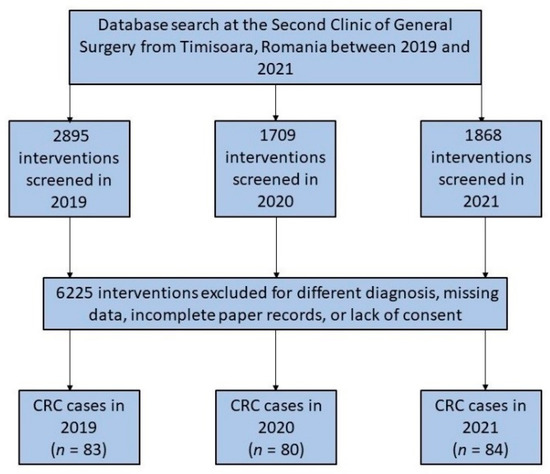 Patients identified with colorectal cancer surgery in their personal records were considered eligible for inclusion in the current study. They were identified by the International Classification of Diseases (ICD-10) diagnosis codes [18]. The objective of this study was to compare the cases of colorectal cancer from the pre-pandemic period with the COVID-19 pandemic period. The pre-pandemic was defined by the 12 months from March 2019 to March 2020, when the pandemic was officially declared in Romania [19]. The first year of the COVID-19 pandemic was from March 2020 to March 2021, while the second year comprised the following 12 months. The worldwide COVID-19 vaccination campaign was at its peak during the second year of the pandemic, allowing for governmental restrictions to be relaxed [20,21].