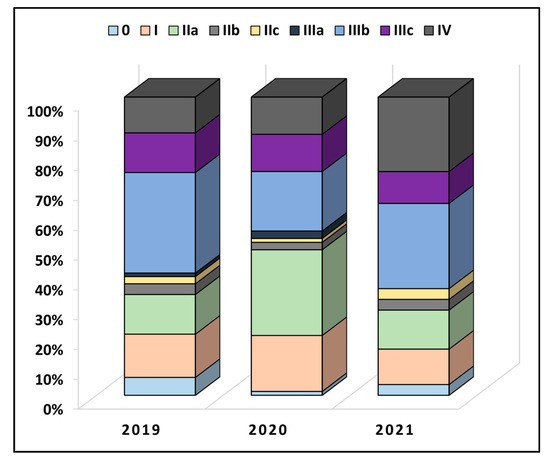 Table 2 describes colorectal cancer characteristics between the years of study. It was observed that a majority of patients had at least two comorbidities at the time of admission (50.6% in 2019 vs. 55.0% in 2020 and 57.1% in 2021), without significant differences. The anatomical distribution of cancer had a colic location in 50 patients in 2019, 48 patients in 2020, and 44 patients in 2021 (p-value = 0.506). Less than 10% of all patients underwent radiotherapy or chemotherapy before the surgical intervention. The overall proportion of TNM staging was also not statistically significant between the pre-pandemic and pandemic period (p-value = 0.120), as seen in Figure 2. However, in 2019, 13.3% of patients had stage IIa, compared with 28.8% in 2020 and 13.1% in 2021 (p-value = 0.012). Similarly, the proportion of very advanced colorectal cancer was higher during the pandemic period of 2020 and 2021 (12.0% in 2019, vs. 12.5% in 2020, and 25.0% in 2021, p-value = 0.038). The lymphovascular invasion was also observed in more than 50% of the entire cohort, although without statistically significant differences.