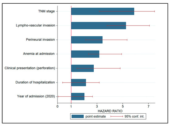 A Cox regression model was used to examine risk variables for cancer progression, and the hazard ratios (HR) are listed in decreasing order in Table 4 and Figure 3. Patients with an advanced TNM stage had a 6.28-fold increased risk of disease progression (p < 0.001), followed by lymphovascular invasion (HR = 5.19, p < 0.001). Other significant variables associated with disease development were perineural invasion (HR = 3.36), anemia during admission (HR = 3.20), and clinical presentation with bowel perforation (HR = 2.77). Other risk variables that were not statistically significant were hospitalization length (HR = 2.18) and intervention during the COVID-19 pandemic, represented by admission years 2020 and 2021 (HR = 1.94, CI = 0.17–2.79).