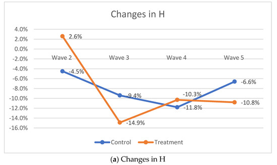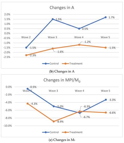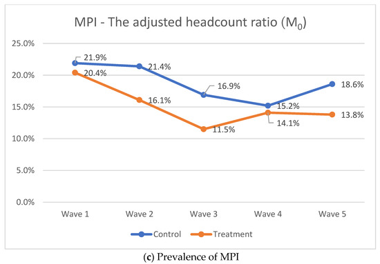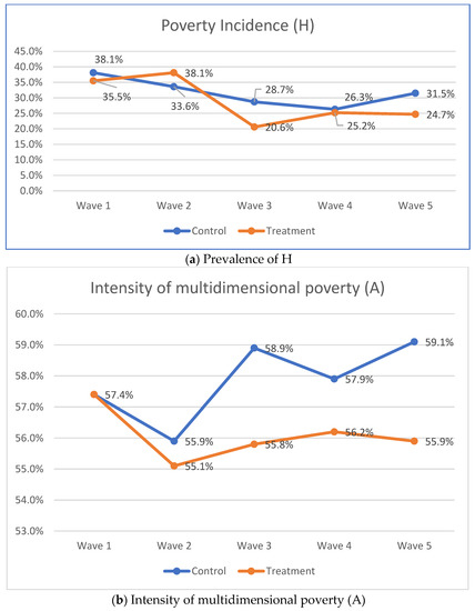 At the time the intervention ended (Year 2), the headcount ratio of those in poverty among the treatment arm participants dropped to 20.6% vs. 28.7% for the control arm. Even though the ratio of people in poverty increased by year 4/Wave 5 (which was 2-year post-intervention), the participant from the treatment arm still did better than the adolescents from the control group—24.7% for the treatment arm vs. 31.5% for the control arm. As Figure 2 shows, by wave 4, the poverty incidents increased, but still, by Wave 5, poverty incidence decreased among the treatment group, while it increased among the adolescents in the control condition (Figure 2).