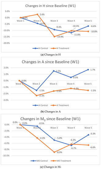 The evaluation of the adjusted headcount ratio (M0) indicates that, although multidimensional poverty decreased for both study conditions, it decreased twice as much for the adolescents in the treatment arm vs. participants in the control arm. Specifically, the observable decrease in the treatment arm was by 6.6 percentage points compared to 3.3 percentage points for adolescents in the control condition (Figure 3).