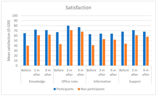 Perceived satisfaction with knowledge, office rules, information and support was rated higher in the participant group at baseline (p < 0.001) (Figure 1).
