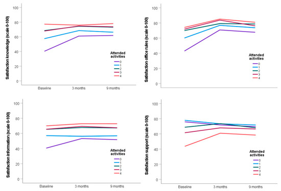 The figures show the change in rated satisfaction with knowledge about ABW, office rules, information and support at baseline, 3 and 9 months after relocation when participating in 1–4 activities, compared to the change in the non-participation group.