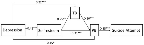 Descriptive statistics and correlations of study variables are displayed in Table 3. As shown, depression was significantly correlated with self-esteem (r = −0.42, p < 0.001). The two factors of interpersonal needs were significantly correlated with suicidal attempt (i.e., TB (r = 0.20, p = 0.002) and PB (r = 0.26, p < 0.001)) and self-esteem (i.e., TB (r = −0.33, p < 0.001) and PB (r = −0.48, p < 0.001)). Therefore, we conducted subsequent mediation analysis with path analysis.