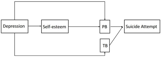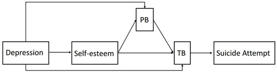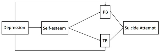 In conclusion, because it is unclear and possibly contradictory in this area, this paper aims to investigate the transition from depression to suicide attempts and the mediating effect of self-esteem, TB, and PB among them. Additionally, more research is needed to investigate the applicability of ITS for young Chinese with suicidal risk. We concentrated on self-esteem, TB, and PB in this paper in an effort to shed light on the transmitting path based on ITS. In an online sample of Chinese people, we formulated the following hypotheses: depression would be a predictor of suicidal attempts through the mediating chains of self-esteem, TB, and PB.